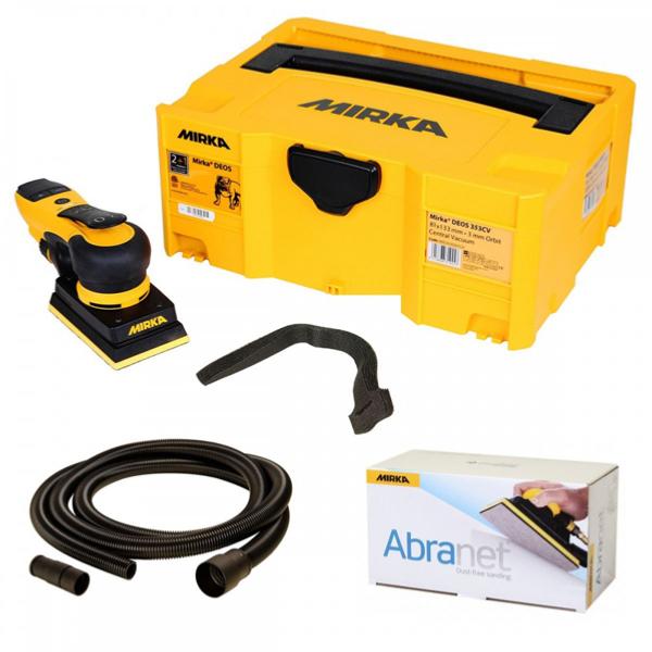 Le pack Pro Mirka DEOS 353CV : 1 ponceuse électrique Mirka® DEOS 353CV 81 x 133 dans sa boîte de rangement + 1 tuyau de 4 mètres + 1 adaptateur universel + 200 coupes Abranet® 81 x 133 mm (P80 x 50, P120 x 50, P180 x 50, P240 x 50) + 6 attaches auto-agrippantes.